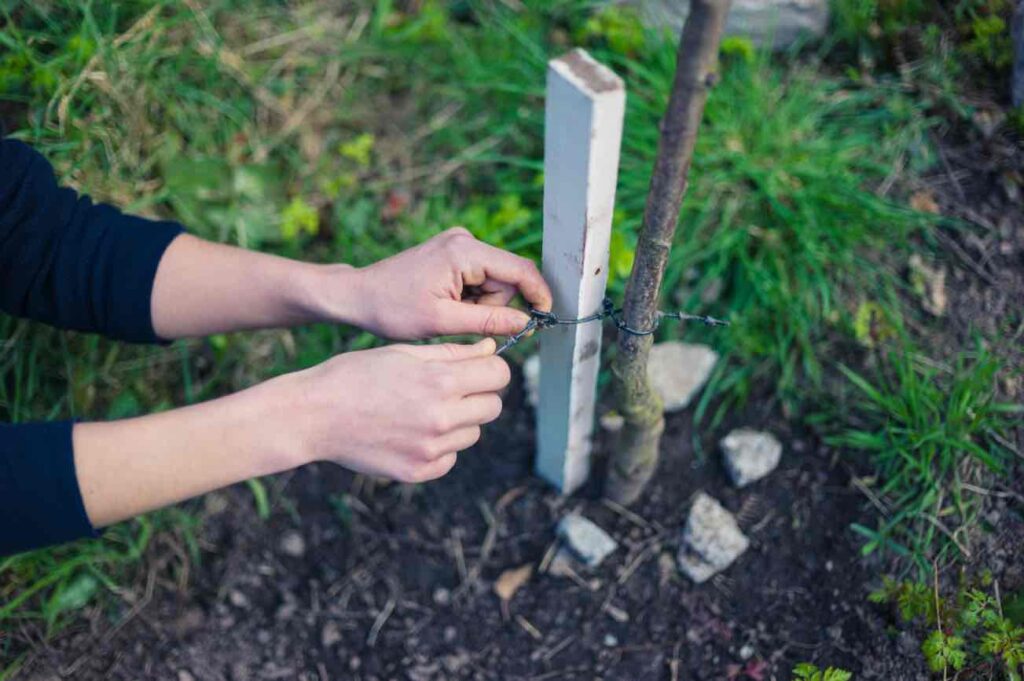 With the tree upright and firmly in place, press the cane or hammer the stake into the soil a few inches away from your tree’s base, taking care not to break any of the roots.